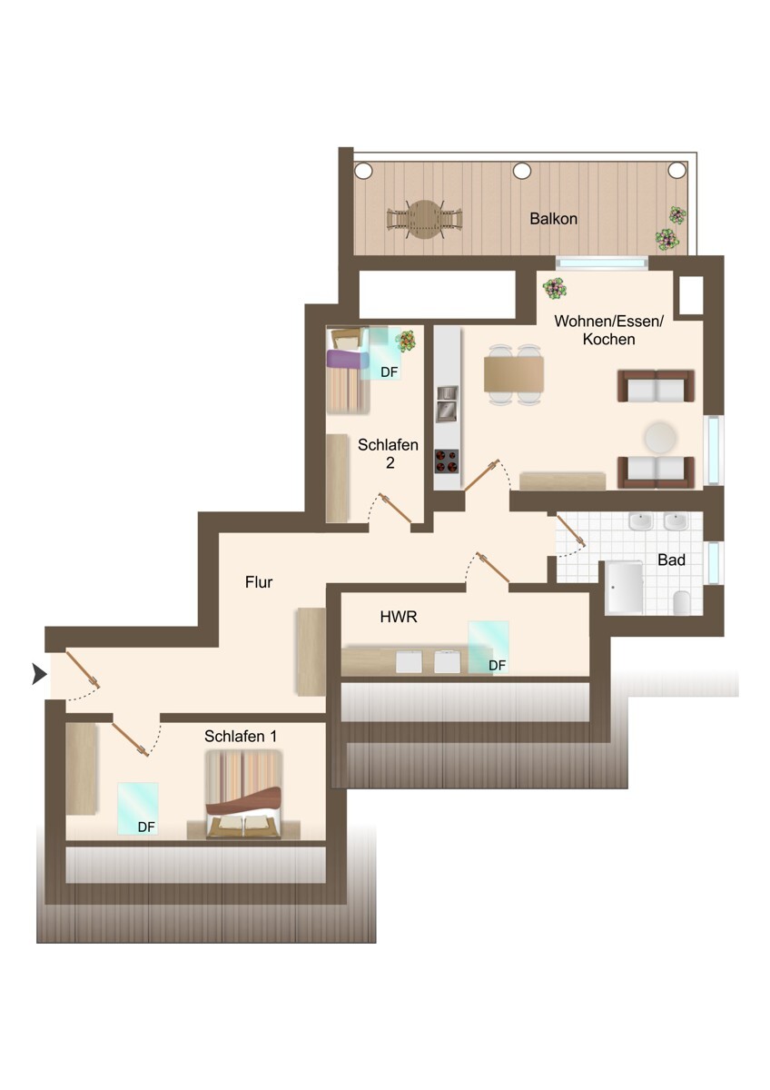 - die Bäder verfügen über eine bodentiefe Dusche, einen WC-Bereich, Handtuchheizkörper und Waschtischanlage