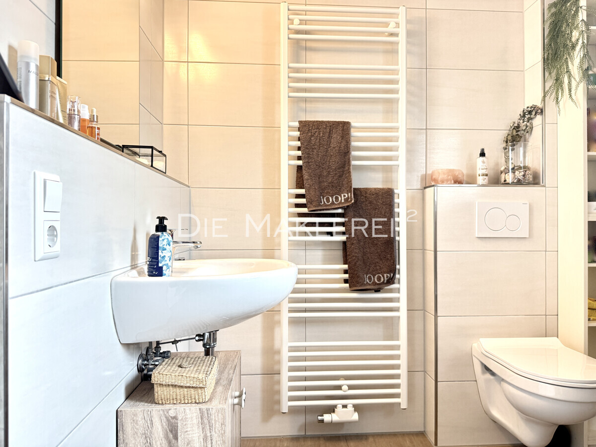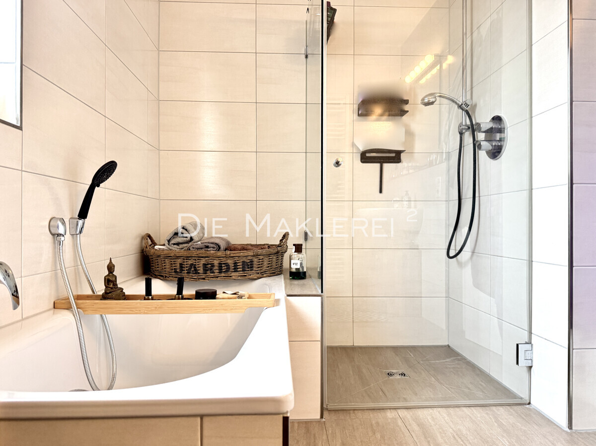 - die Bäder verfügen über eine bodentiefe Dusche, eine Badewanne, einen WC-Bereich, Handtuchheizkörper und Waschtischanlage