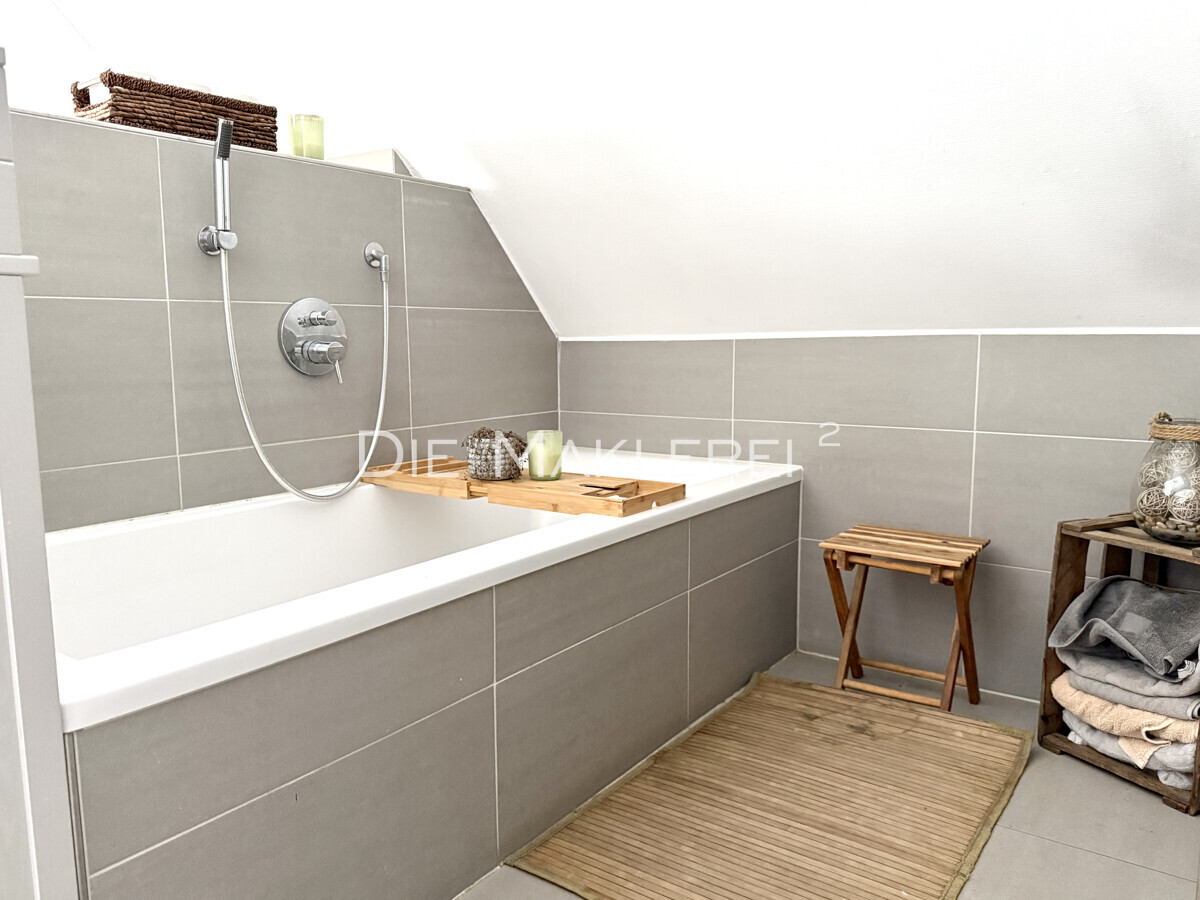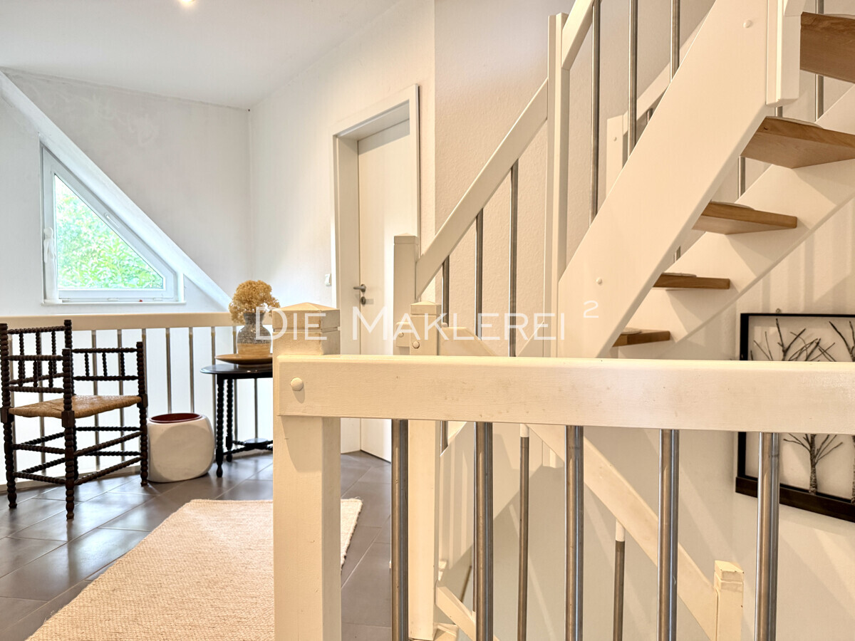 Über eine offene Massivholztreppe gelangt man vom Erdgeschoss bis zum Dachboden. Hier befindet sich zusätzlicher Stauraum und die Gasbrennwerttherme. Im Dachschoss stehen drei großzügige Schlafzimmer und ein Bad/WC mit Doppelwaschtisch, bodentiefer Dusche, Badewanne und WC zur Verfügung. Der Balkon in Süd-West-Lage ist über zwei Schlafzimmern erreichbar.