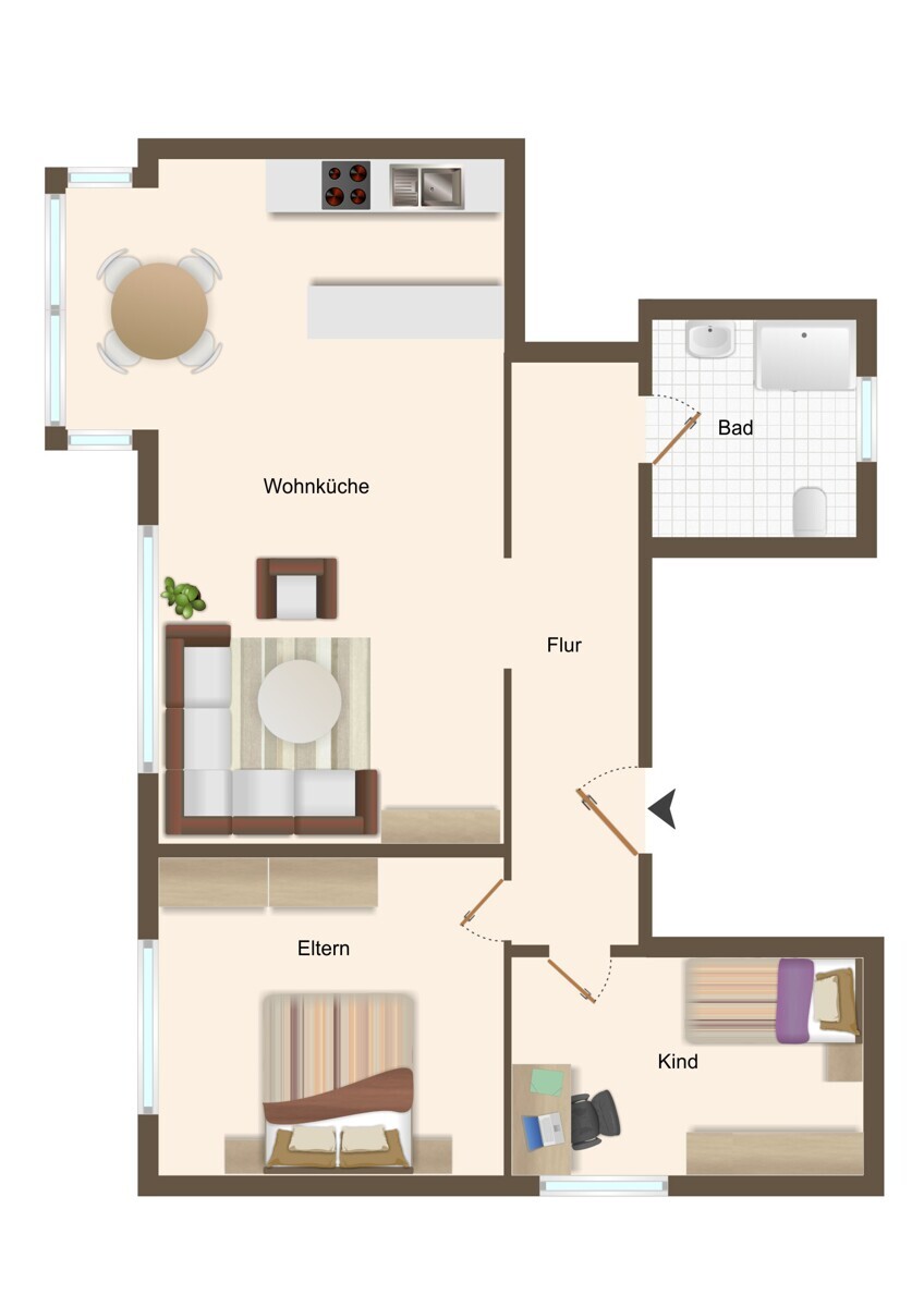 Diese ca. 97 qm große Wohnung befindet sich im Erdgeschoss der Immobilie und überzeugt durch eine raffinierte Raumaufteilung. Sie bietet bis zu 2 Schlafzimmer, ein Badezimmer mit ebenerdiger Dusche und eine Wohnküche. Eine nach Abstimmung optional nutzbare Gartenfläche sowie Parkplätze für PKW und Fahrrad runden das Angebot ab.Die Wohnung teilt sich wie folgt auf: